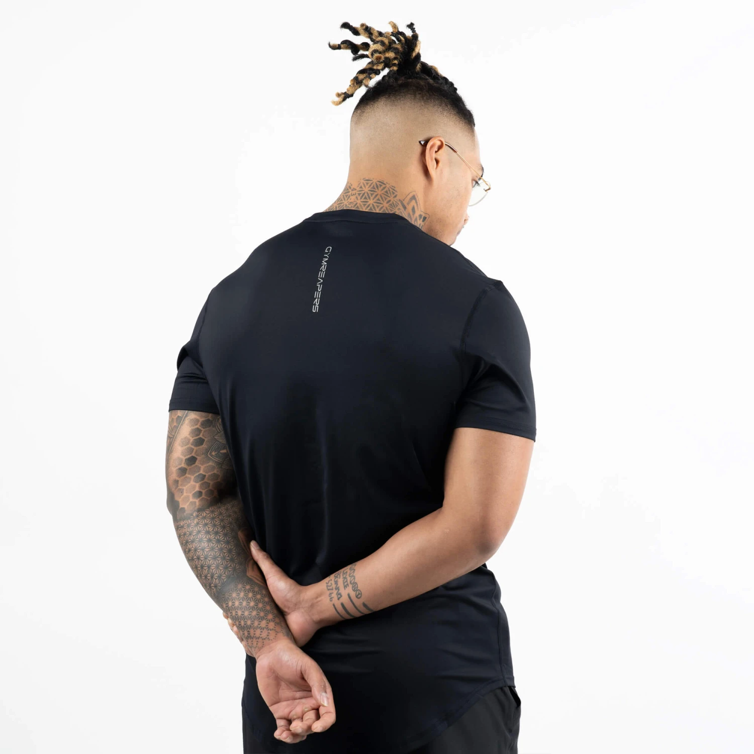 The model is 185lbs, 5’10” wearing a size large in both the shirt & 5″ performance shorts.