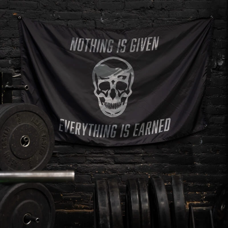Represent the same mentality and elevate any training space, gym, or garage with the Gymreapers Skull Mantra flag in Gray Camo.