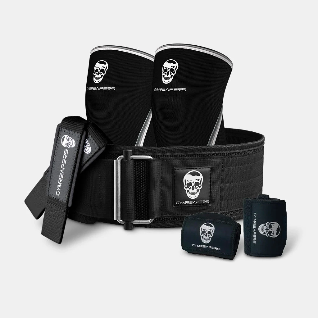 The Gymreapers Training Kit includes one of our top-rated Quick Locking Belts, 7mm Knee Sleeves, Padded Lifting Straps, and 18″ Wrist Wraps.